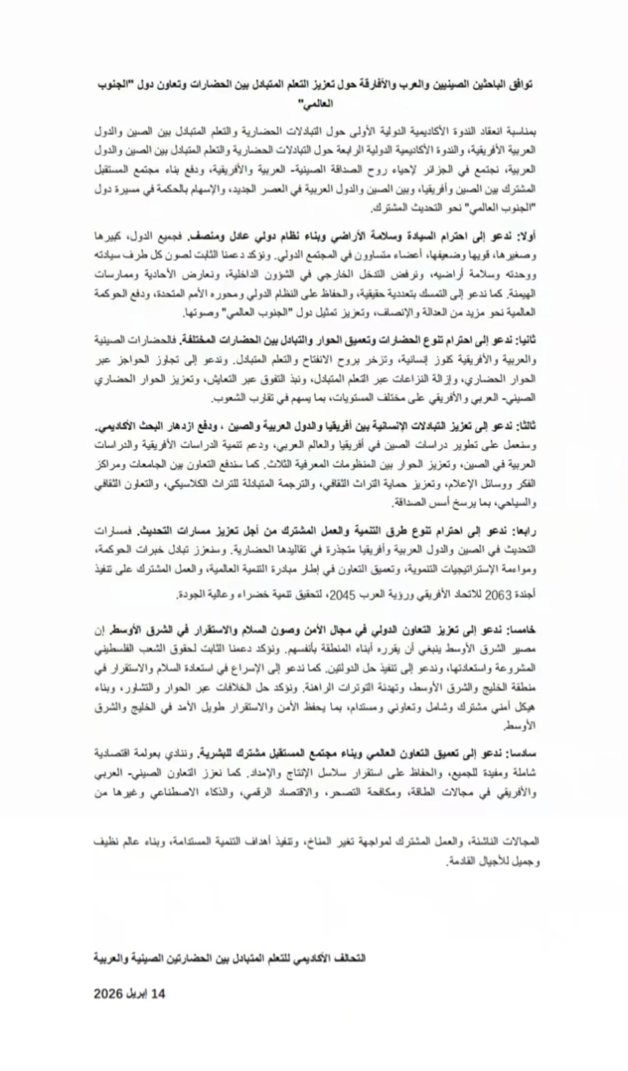 三、我们呼吁加强中非、中阿人文交流,推动学术繁荣发展。我们将推动中国学在非洲和阿拉伯世界的研究,支持非洲学、阿拉伯学在中国发展,促进三方知识体系对话。推动高校、智库、媒体合作,加强文化遗产保护、典籍互译及文旅合作,夯实友好根基。