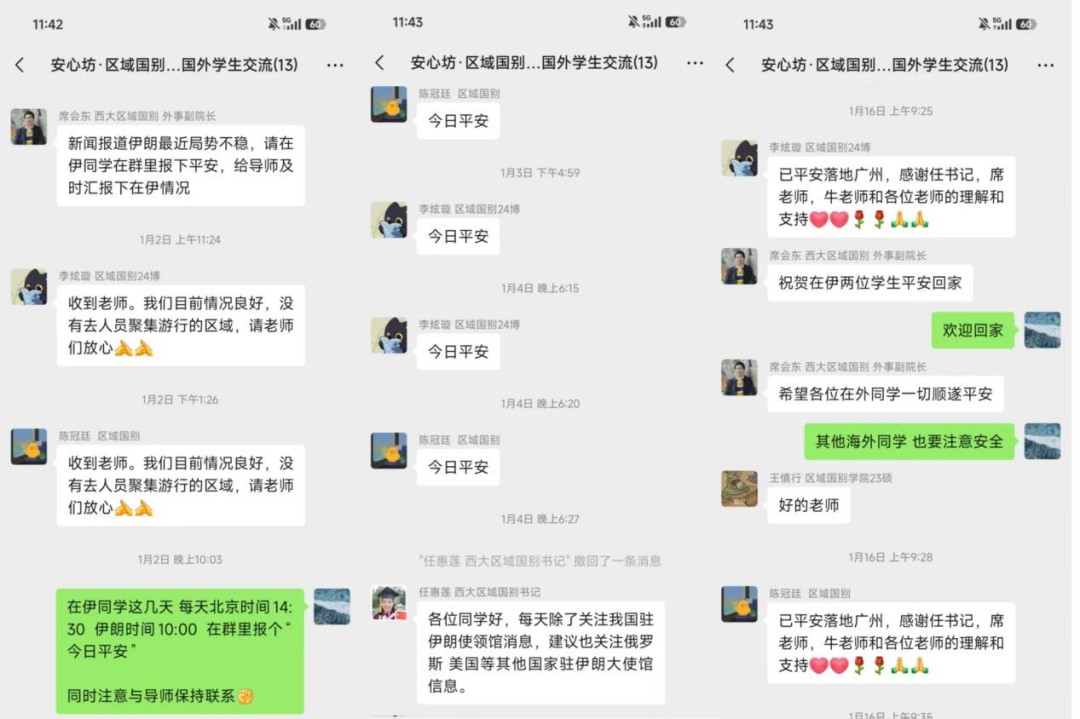 值得庆幸的是,我们身在海外,又遇到伊朗社会动荡,但始终能感受到家人与学院老师的关心帮助。当国内收到伊朗局势紧张的消息后,学院立刻启动了“留学盾”海外应急处置机制。自1月2日起,学院书记、外事副院长、辅导员、外事秘书等老师,持续关注我们在伊朗的实时状况,我们也在学院“安心坊”海外留学联络群定时向国内报平安。1月6日,学院启动应急预案,开始指导我们妥善应对伊朗国内乱局。1月8日伊朗当地时间18时起,伊朗国内网络开始被限制。1月9日学校立刻成立了伊朗访学应急处置工作组,努力寻找一切可能的联络渠道,并在短暂的通讯窗口期为我们传递了关键消息。1月12日学院召开党政联席会,针对伊朗国内情况,结合校内外伊朗问题专家意见,科学研判,多方协调,决定立刻启动撤离预案。随后,学院组织国内外多方力量,抢在撤离窗口期,为我们统一安排了回国航班。学院的迅速反应和有力组织,为我们顺利平安回国起到了关键作用。