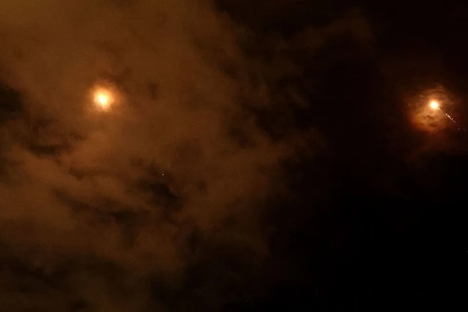 当地时间2026年3月25日,以色列内坦亚,伊朗对以色列发动新一轮导弹袭击,火箭弹划过内坦亚上空。(视觉中国 / 图)
